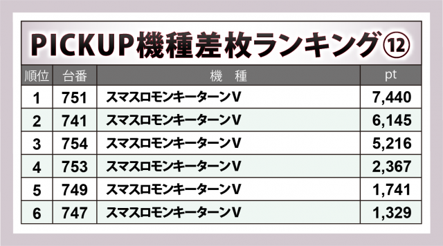 『スマスロモンキーターンⅤ』14台は半数を切るプラス台数だったが、その6台が全て4桁プラスを収めた。751番台の+7千4百超を皮切りに+6千1百超・+5千2百超・+2千4百弱・+1千7百超・+1千3百超と並んだ。
