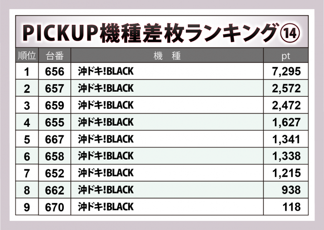 『沖ドキ!BLACK』20台ではプラス率が5割手前に迫り、656番台の+7千3百弱でコーナーのナンバーワンとなった他、+2千超×2・+1千超×4と、メダル機のポテンシャルを十分に活かしていた。