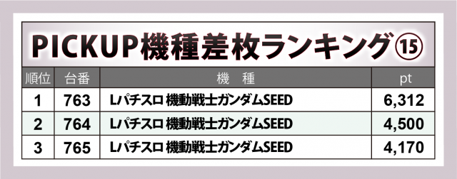 この週頭に導入が開始された『Lパチスロ 機動戦士ガンダムSEED』7台では表の3台が勝利。+6千3百超×1・+4千超×2と、こちらもハイクオリティを誇った。