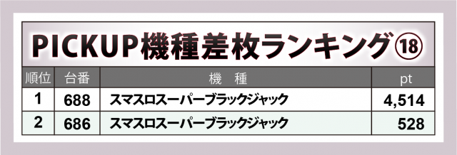 『スマスロスーパーブラックジャック』4台も勝利台は5割に。688番台の+4千5百超という差枚数が光った。