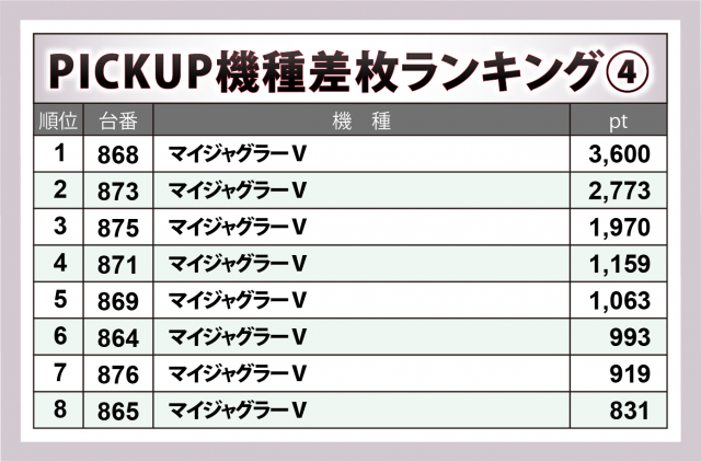 『マイジャグ』20台もプラス台割合は5割に及ばず。しかし868番台が+3千6百に達した上に+2千8百弱が1台・+1千超が3台と、内容は悪くなかった。