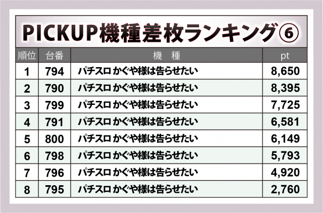 『パチスロ かぐや様は告らせたい』11台は8台が勝利と2回連続で高勝率を実現。5桁プラスこそなかったが、勝った台全てが+2千7百超となった上に、+8千超・+6千超が2台ずつ&+7千7百超・+5千8百弱・+4千9百超・+2千8百弱が1台ずつと、店内随一の好況に沸いていた。