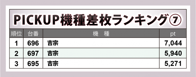 『吉宗』は設置3台がオールプラスの快挙。しかも+7千超・+5千9百超・+5千3百弱が1台ずつと重量級の出玉がズラリ。