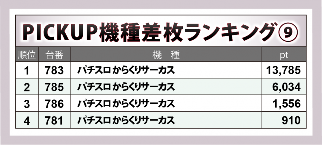『パチスロ からくりサーカス』9台は惜しくもプラス率5割を満たさなかったが、783番台が+1万3千8百弱で全401台の頂点に輝き、次いで+6千超・+1千6百弱が1台ずつと、他機種に匹敵した。