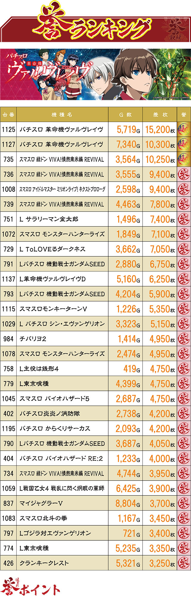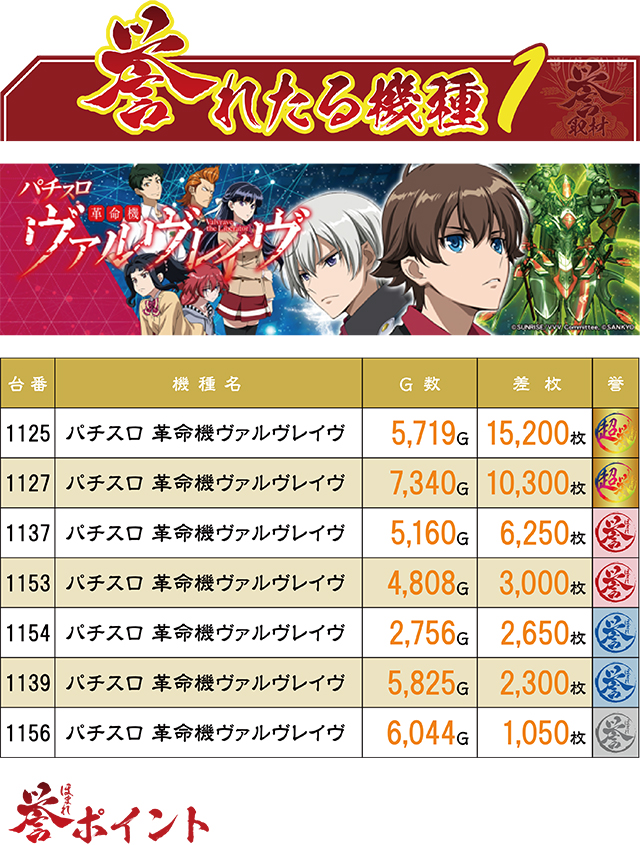 前回も大量の誉レコード(=1,000枚以上)を生み出した『パチスロ 革命機ヴァルヴレイヴ』の暴れっぷりはこの日も健在!10,000枚超えレコード2台を含む、計7台の誉レコードを生み出した。次回も『ヴヴヴ』の結果に注目!?
