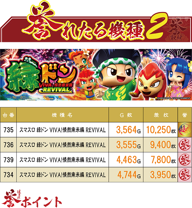 2回目の誉取材となる今回は、3台の10,000枚超えが誕生!怒涛のATラッシュで『パチスロ 革命機ヴァルヴレイヴ』が1・2位を独占する驚愕の結果となった。また新台の『スマスロ 緑ドン VIVA!情熱南米編 REVIVAL』が3・4位に連続ランクインを果たし、この2機種が圧倒的な強さを見せつける結果に。