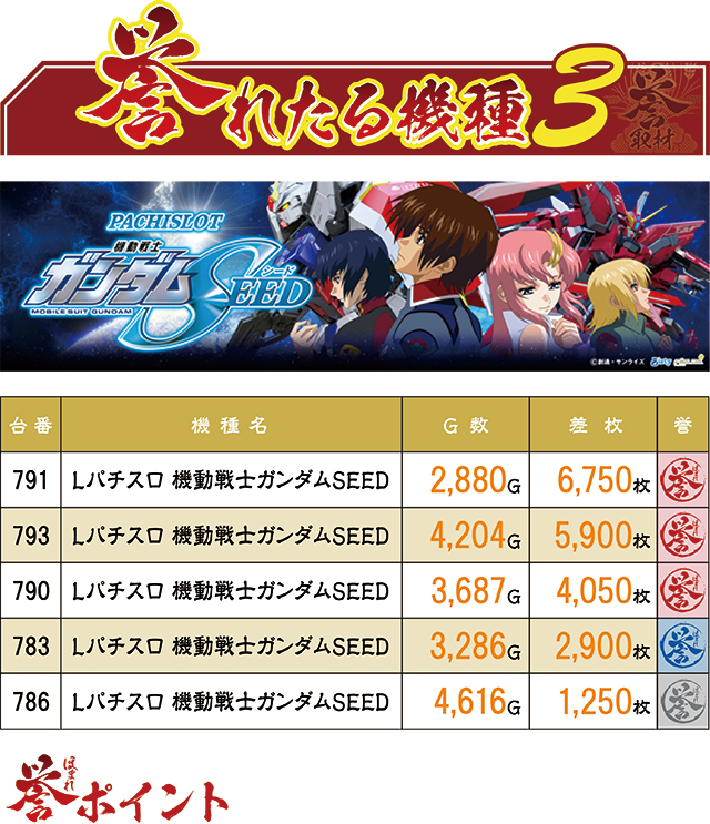 同じく新台の『Lパチスロ 機動戦士ガンダムSEED』からは5台の誉レコードが出現。特に赤誉マークの3台は挙動も良好だったようで、安定した動きでそれぞれ4,000枚を突破した。