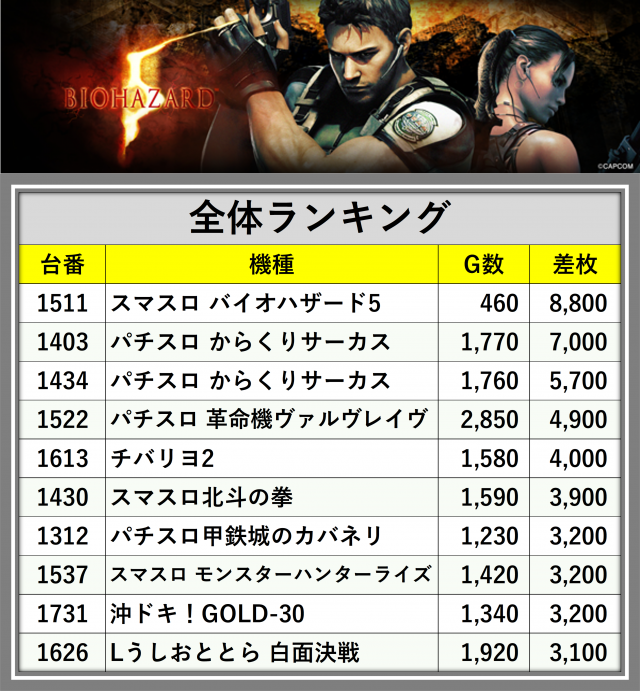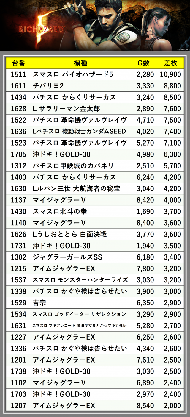 厳選された取材対象機種をはじめ、その他スロット全体から好記録が飛び出した!プレイヤーが楽しんだ1日を下記データにて振り返ってみて欲しい。