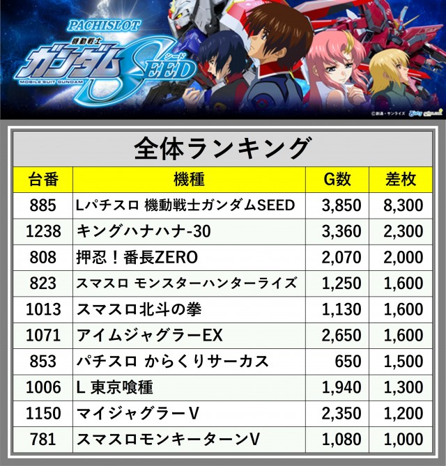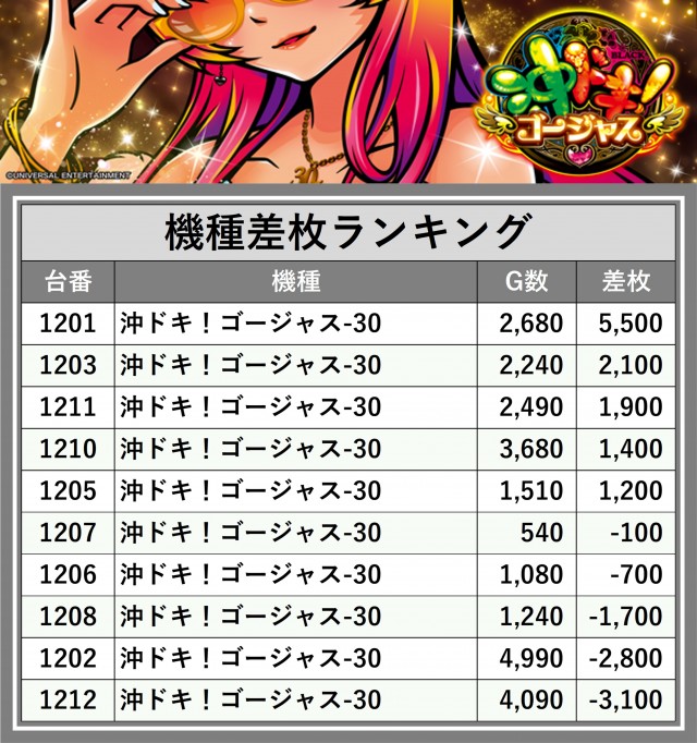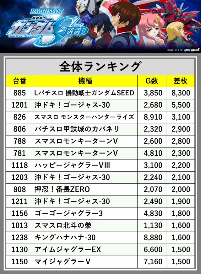 厳選された取材対象機種をはじめ、その他スロット全体から好記録が飛び出した!プレイヤーが楽しんだ1日を下記データにて振り返ってみて欲しい。