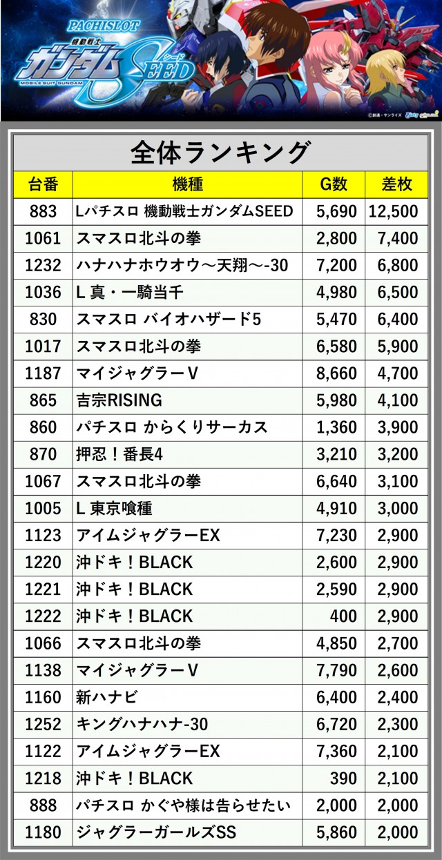 厳選された取材対象機種をはじめ、その他スロット全体から好記録が飛び出した!プレイヤーが楽しんだ1日を下記データにて振り返ってみて欲しい。