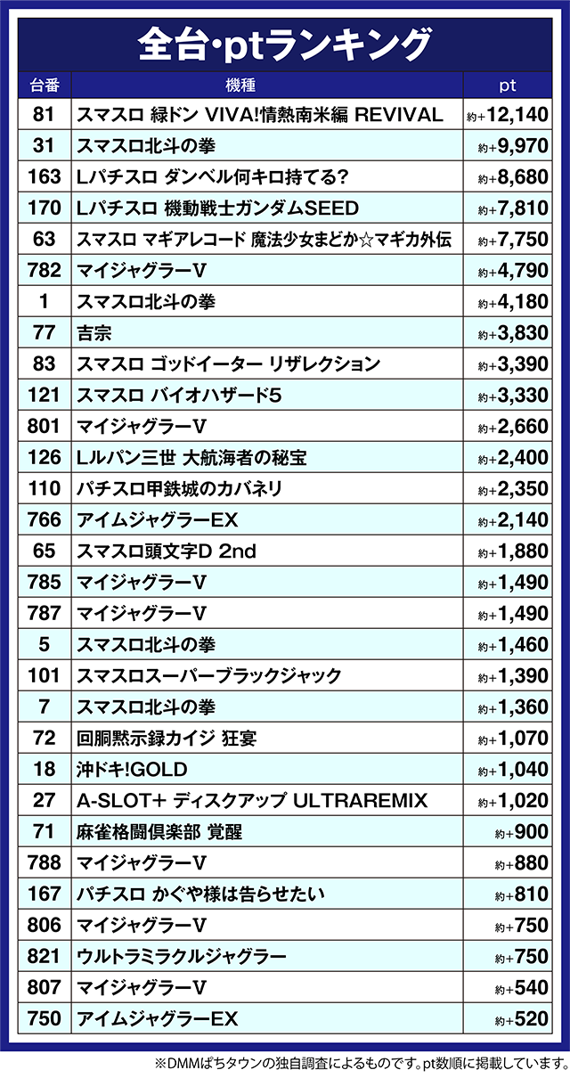 4台が約+1,300ptを超えた「スマスロ北斗の拳」では、31番台が約+10,000ptクラスとなった。