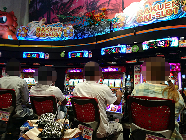 新台の「CRリング 終焉ノ刻」や「CRスーパー海物語IN沖縄4」なども人気。あちこちでプレイヤーの活躍が見られ、シマ全体に華やかな光景が広がっていた。
