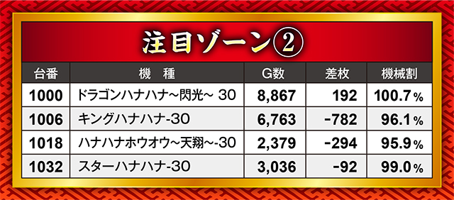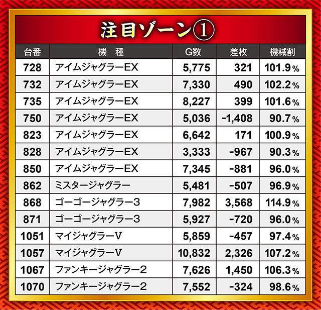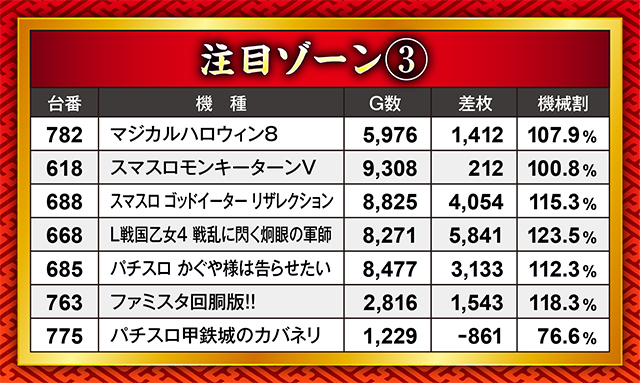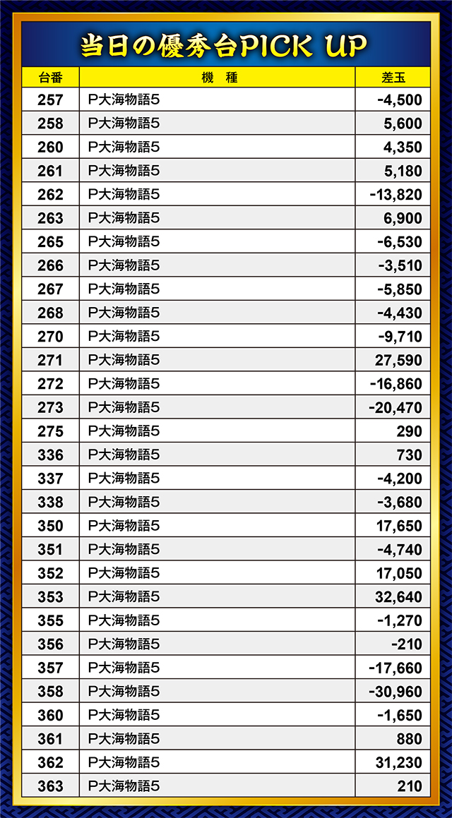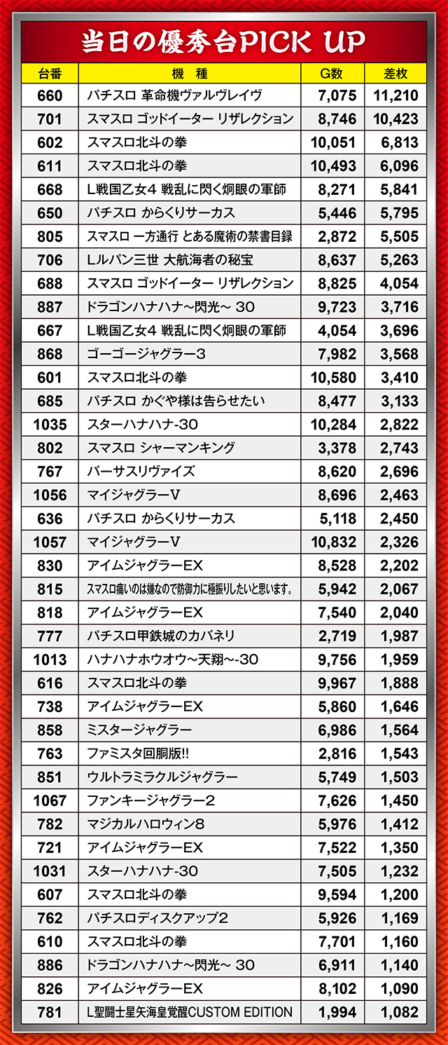 その他、好挙動を見せていたのが上の台。その良好な挙動通りにしっかりプラっていた台もあれば、残念ながら運に見放されマイナスで終わってしまった台も…。