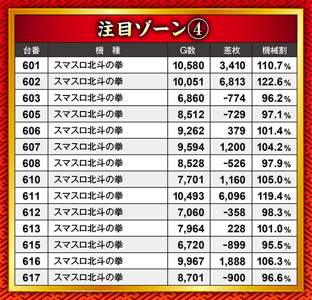 前回に続き、今回も『スマスロ北斗の拳』の強さが際立っていたように思う。また、10,000枚オーバー台が2台も誕生するなど、『北斗』以外の機種にもチャンスが潜んでいたのは明白。また『ジャグラー』シリーズが活性化していたのもお約束で、今回も期待以上の結果を披露してくれた。