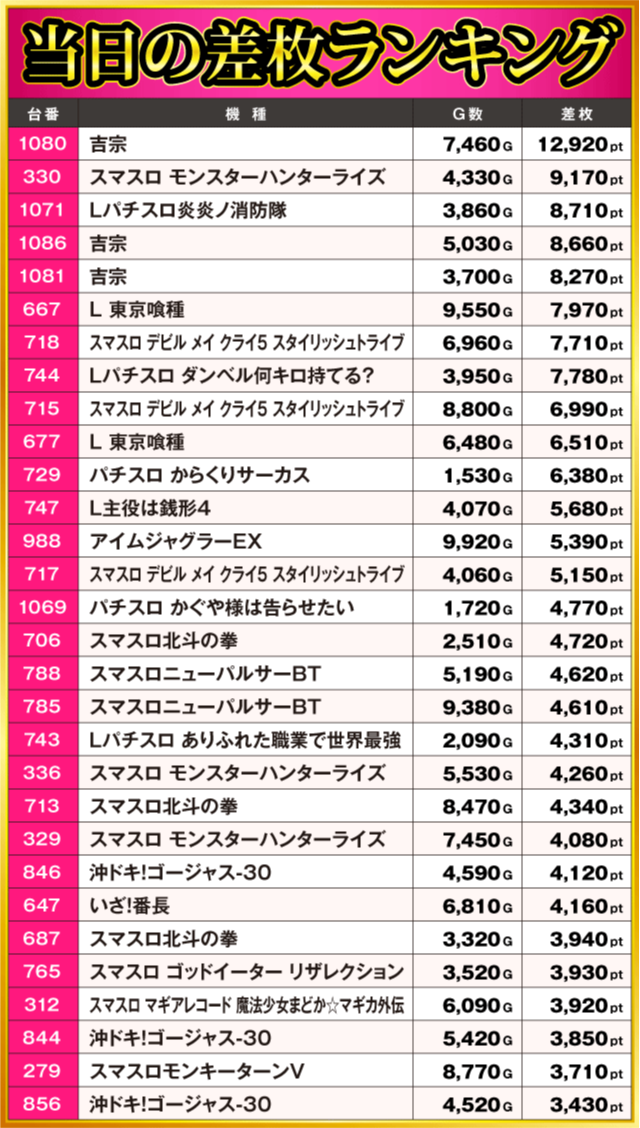 この日は、メイン機種から少台数機種にいたるまで、好記録が並ぶように多数の場所で確認された。そんな中、特に勢いを見せていたのが『吉宗』で、1080番台が+12,920ptを叩き出しランキングトップに。さらに、1086番台と1081番台が+8,000pt超を記録している。