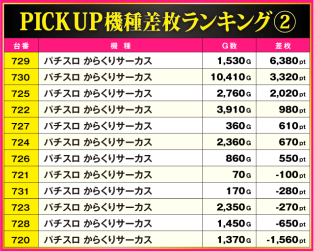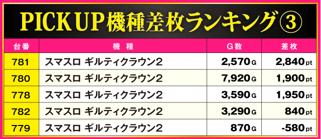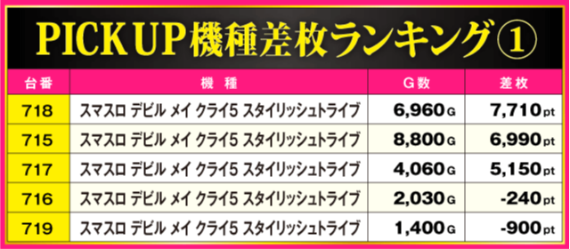 続いてPICK UP機種の状況をチェックしていこう。『スマスロ デビル メイ クライ5 スタイリッシュトライブ』からは+7,710pt、『パチスロ からくりサーカス』からは+6,380ptが発生。また、『スマスロ ギルティクラウン2』は全5台中4台がプラス差枚となる見事な結果を残しファンを喜ばせていた。