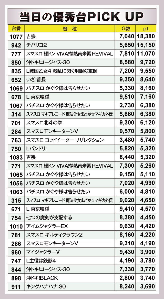 圧倒的な輝きを放ったのは『吉宗』。1077番台が+18,380ptと誰もがうらやむ成績を残した。そして『チバリヨ2』942番台が+15,150pt、『スマスロ 緑ドン VIVA!情熱南米編 REVIVAL』777番台が+11,070ptと1万ptオーバーがつづく。以下にも『沖ドキ!ゴージャス-30』850番台の+9,720ptなど、超優秀台が続出する大満足のデータとなっていた。