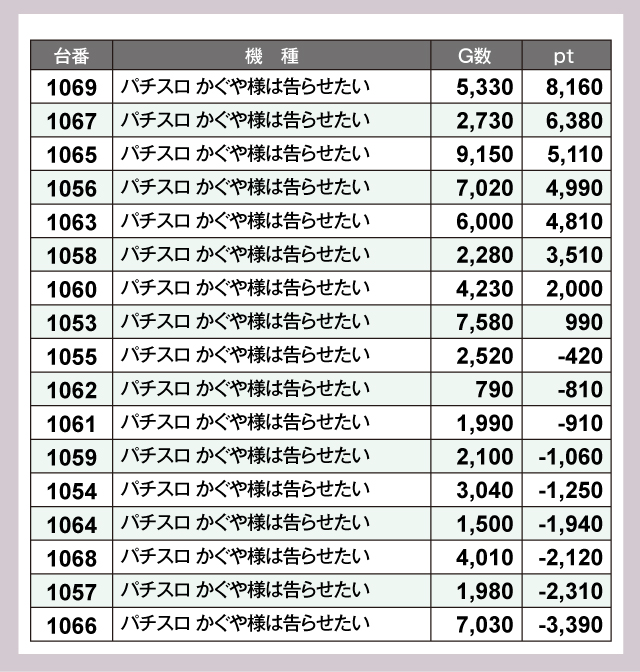 17台中8台がプラスとなった『パチスロ かぐや様は告らせたい』。+8,160ptや+6,380ptなども飛び出し、この日はどの機種よりも注目を集めていた。