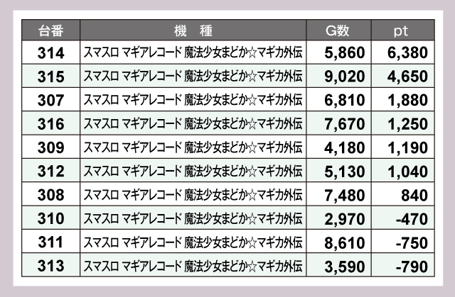 『スマスロ マギアレコード 魔法少女まどか☆マギカ外伝』は10台中7台がプラスpt。+6,380ptの314番台や9,020G回された315番台の活躍もあり、終始熱気に包まれていた。