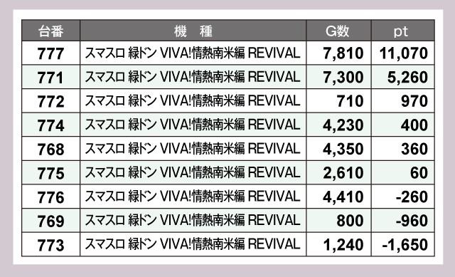 『スマスロ 緑ドン VIVA!情熱南米編 REVIVAL』は1万pt超えの777番台が大きく牽引し、トータルptでもプラスとなっている。