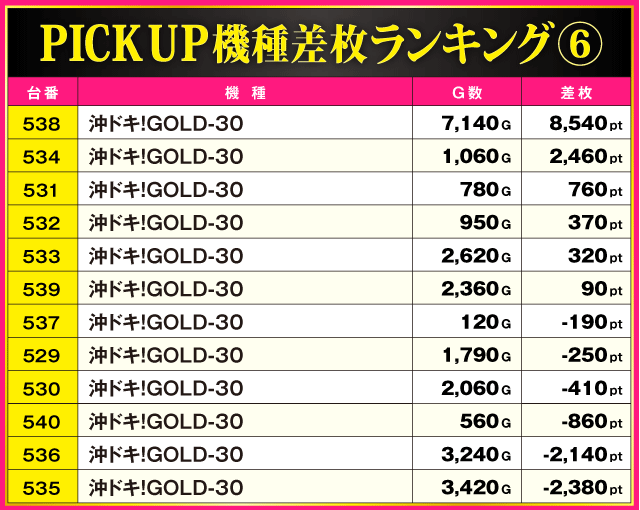 今回のPICK UP機種は全6機種。特に目立っていたのが沖ドキ!シリーズで、それぞれの機種から多数の好調台が確認されている。最終的に3機種合わせた全30台中18台がプラス差枚となっているだけに、ファンにとって充実の一日となったのは間違いないだろう。