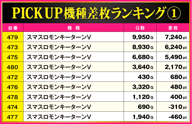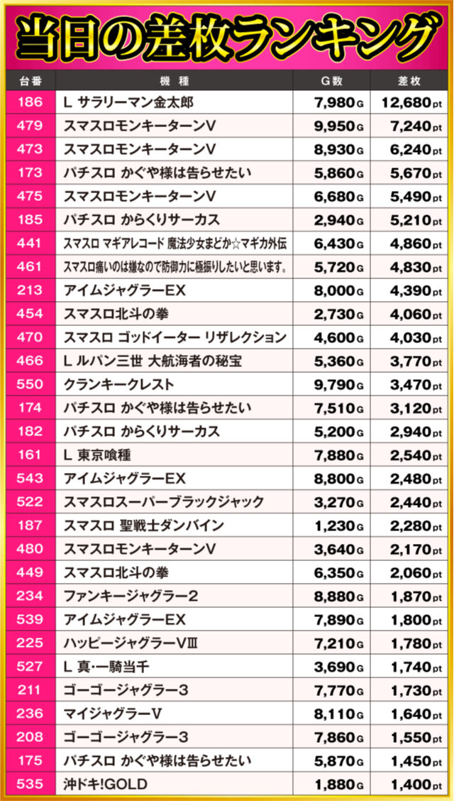 この日、最もプレイヤーの注目を集めていたのが『L サラリーマン金太郎』で、186番台が万枚超の+12,680ptを叩き出しランキングトップに。次いで『スマスロモンキーターンV』が+7,240pt、+6,240ptといったハイスコアを連発させファンを喜ばせていた。
