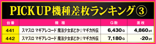 今回のPICK UP機種は全3機種で、ランキング上位機種以外では『パチスロ かぐや様は告らせたい』から+5,670pt、『スマスロ マギアレコード 魔法少女まどか☆マギカ外伝』から+4,860ptを確認。しかも、3機種トータルの全14台中11台がプラス差枚となっているだけに、それぞれのシマは常に活気に包まれていた。