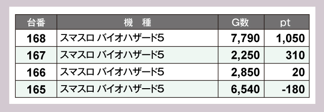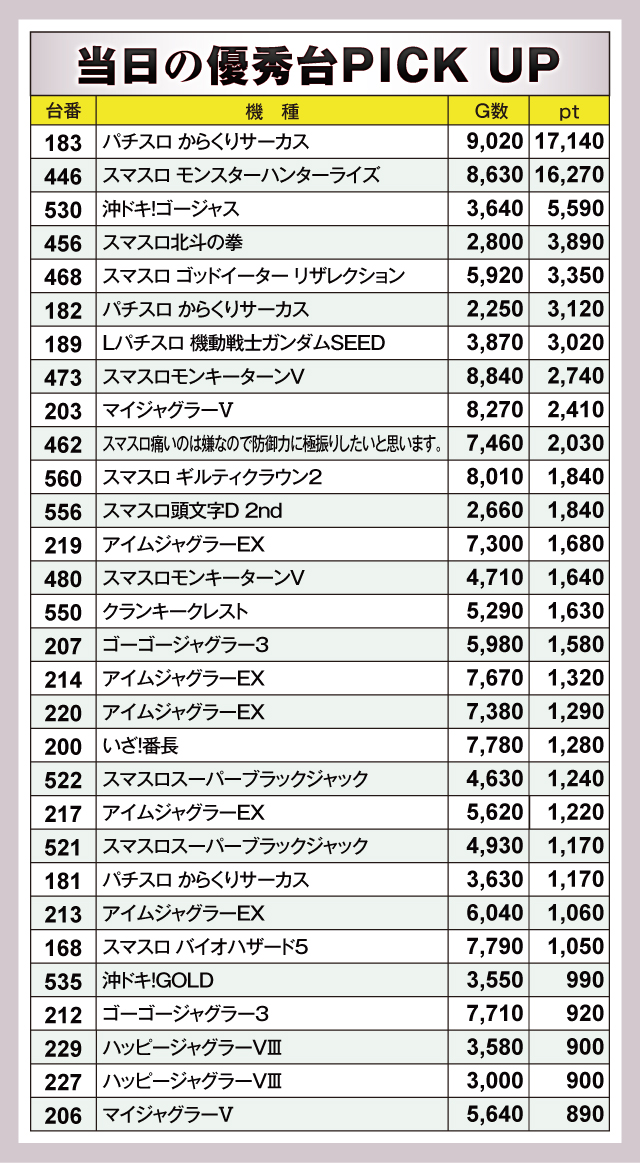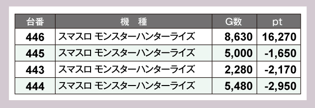 『パチスロ からくりサーカス』183番台の+17,140pt、『スマスロ モンスターハンターライズ』446番台の+16,270ptと1万ptオーバーの優秀台が並ぶ。ほかにも『沖ドキ!ゴージャス』530番台の+5,590ptなど、実力を発揮した台があちらこちらで確認できた。