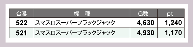 2台設置の『スマスロスーパーブラックジャック』はどちらの台もプラスptで終わっていて、安定感を発揮していた。