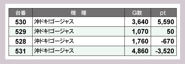 『沖ドキ!ゴージャス』は4台中2台がプラス。530番台の活躍もあり、トータルptではプラスだった。