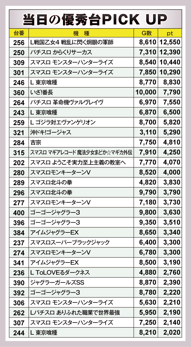 この日は1万ptオーバーが4台出現。『L戦国乙女4 戦乱に閃く炯眼の軍師』256番台が+12,550pt、『パチスロ からくりサーカス』250番台が+12,390ptと誰もがうらやむ結果を残した。そして『スマスロ モンスターハンターライズ』の309番台が+10,440pt、301番台が+10,290ptとつづく。ほかにも優秀台が多数うまれていて、見応えのあるデータが出来上がっていた。