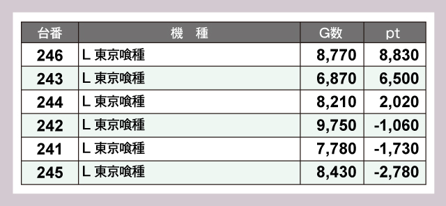 『L 東京喰種』は全体的に稼働も高く、246番台や243番台などの優秀台も生まれている。