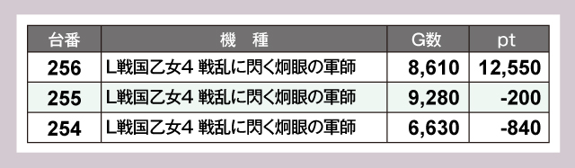3台設置の『L戦国乙女4 戦乱に閃く炯眼の軍師』は256番台の活躍もあり、トータルで大きくプラスとなっていた。