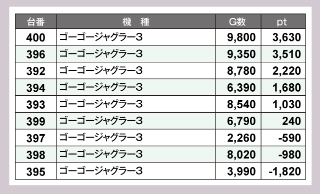 『ゴーゴージャグラー3』は9,000G超えが2台出現し、高稼働に結果もついてきた形で終わっている。