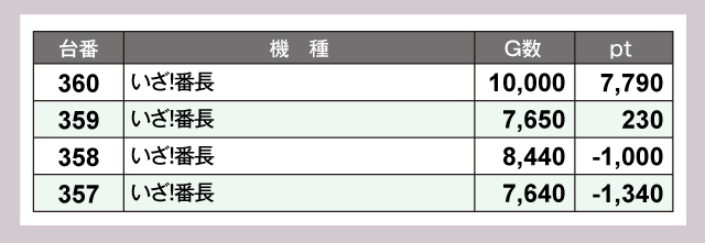 『いざ!番長』は360番台が1万Gを達成し、ptも大きくプラスを叩きだした。