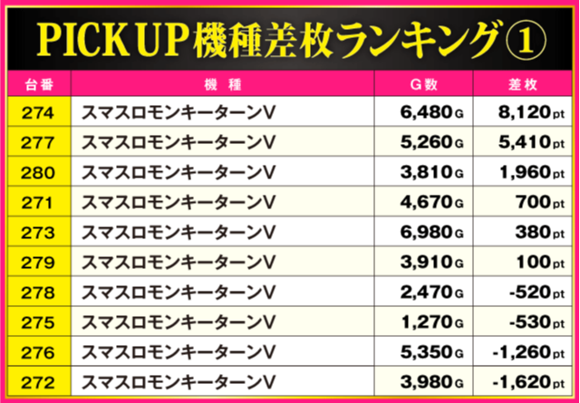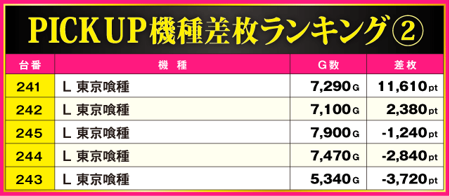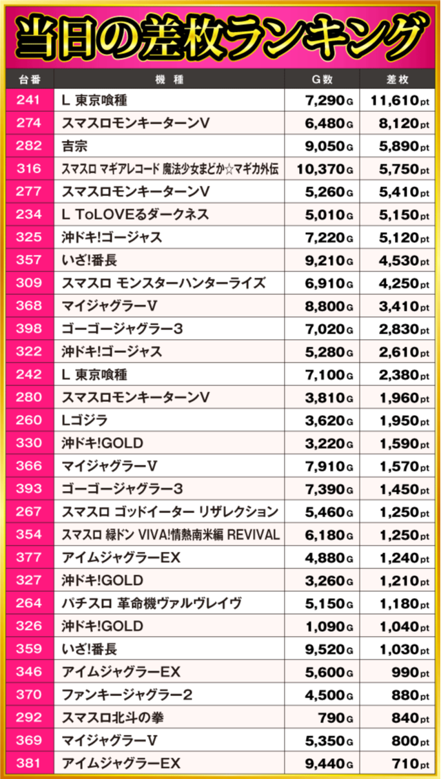 この日は、人気のスマスロを中心に多数の好調台を確認。そんな中、『L 東京喰種』が万枚超の+11,610ptを叩き出しランキングトップに輝いた。また、その他にも『スマスロモンキーターンV』の+8,120ptをはじめ様々な機種から+5,000pt超が大量発生している。