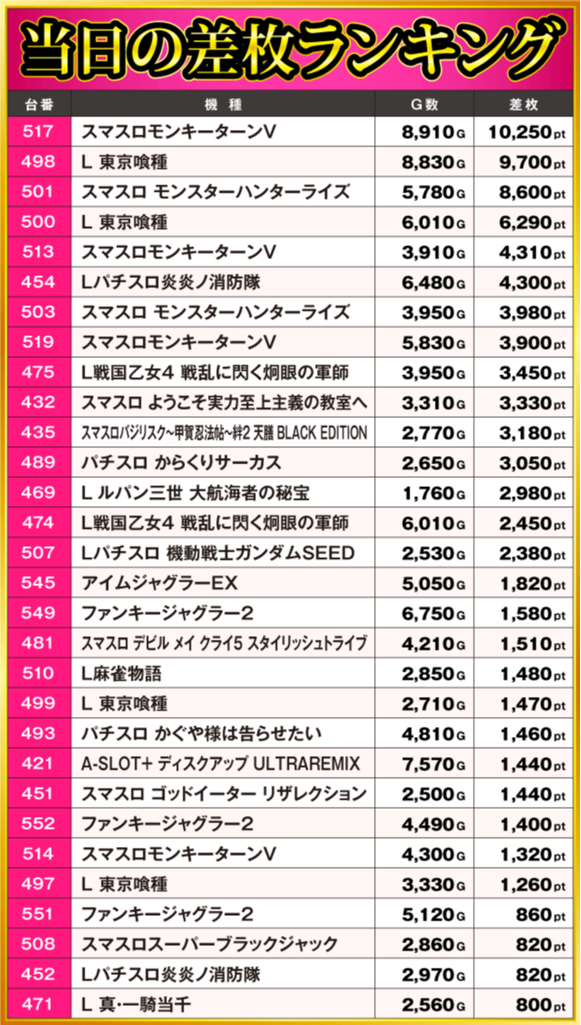 この日、最もプレイヤーの注目を集めたのが『スマスロモンキーターンV』で、517番台が+10,250ptを記録しランキングトップに。次いで『L 東京喰種』から+9,700pt、『スマスロ モンスターハンターライズ』から+8,600ptと、人気のスマスロを中心にハイスコアが連発している。