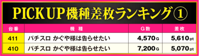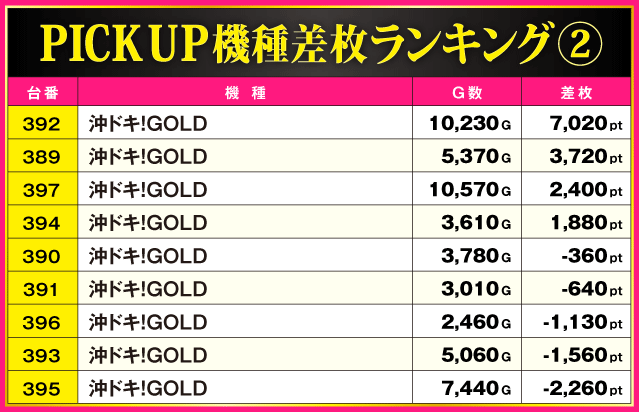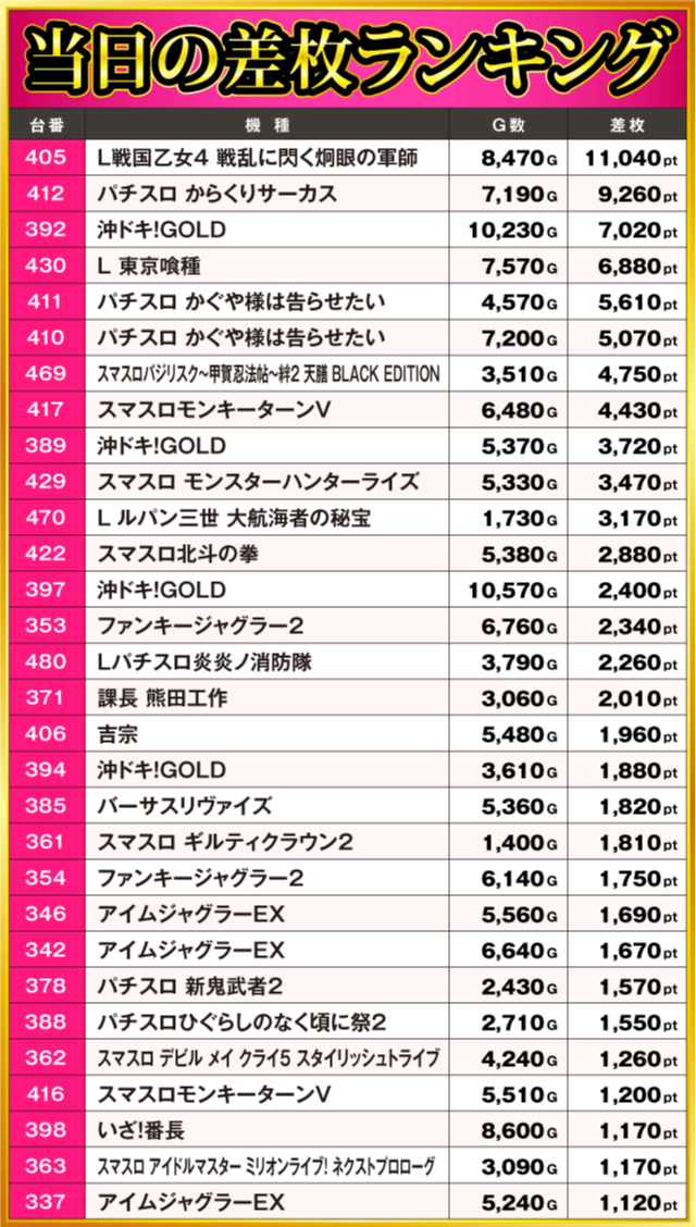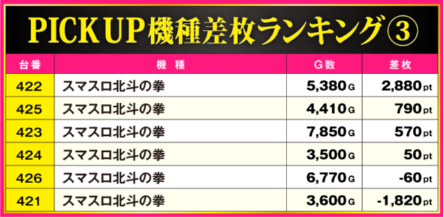 続いてPICK UP機種の状況を見ていこう。ランキング上位機種以外からも多数の好調台が確認されており、『沖ドキ!GOLD』からは+7,020ptが発生。また、『スマスロ北斗の拳』は、全6台中4台がプラス差枚となる見事な結果を残しているだけに、ファンにとって充実の一日となったのは間違いないだろう。