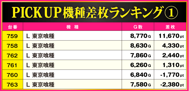 この日は、人気のスマスロを中心にハイスコアが続出。そんな中、『L 東京喰種』が+11,670ptを叩き出しランキングトップに。次いで『いざ!番長』が僅差の+11,060ptを記録し2位にランクインしている。さらに、Aタイプながらジャグラーシリーズも奮闘し店内を盛り上げていた。