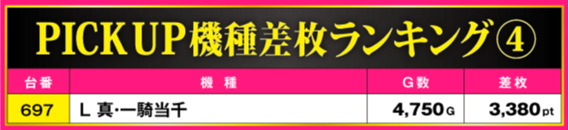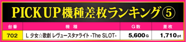 今回のPICK UP機種は全5機種。特に目立っていたのが『スマスロ マギアレコード 魔法少女まどか☆マギカ外伝』と『ジャグラーガールズSS』で、両機種とも設置されてる3台全てがプラス差枚に。また、『L 真・一騎当千』や『L 少女☆歌劇 レヴュースタァライト -The SLOT-』といったバラエティコーナーからもしっかりと好成績が確認されている点は注目ポイントと言えるだろう。