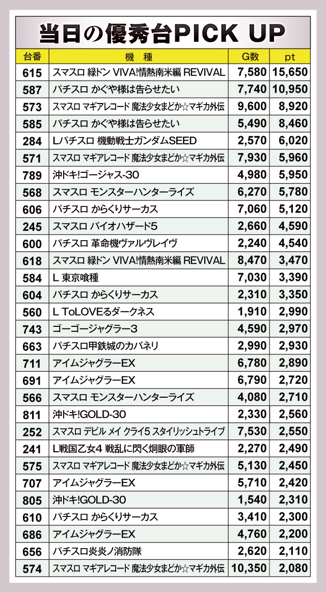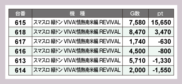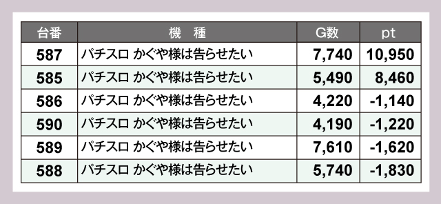 この日は2台の1万pt超えが誕生した。『スマスロ 緑ドン VIVA!情熱南米編 REVIVAL』615番台が+15,650pt、『パチスロ かぐや様は告らせたい』587番台が+10,950ptと誰もがうらやむ結果を残している。