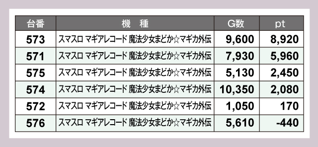 以下『スマスロ マギアレコード 魔法少女まどか☆マギカ外伝』573番台の+8,920pt、『パチスロ かぐや様は告らせたい』585番台の+8,460pt、『Lパチスロ 機動戦士ガンダムSEED』284番台の+6,020ptと優秀台が並ぶ。結果、非常に見応えのあるデータに仕上がっていた。