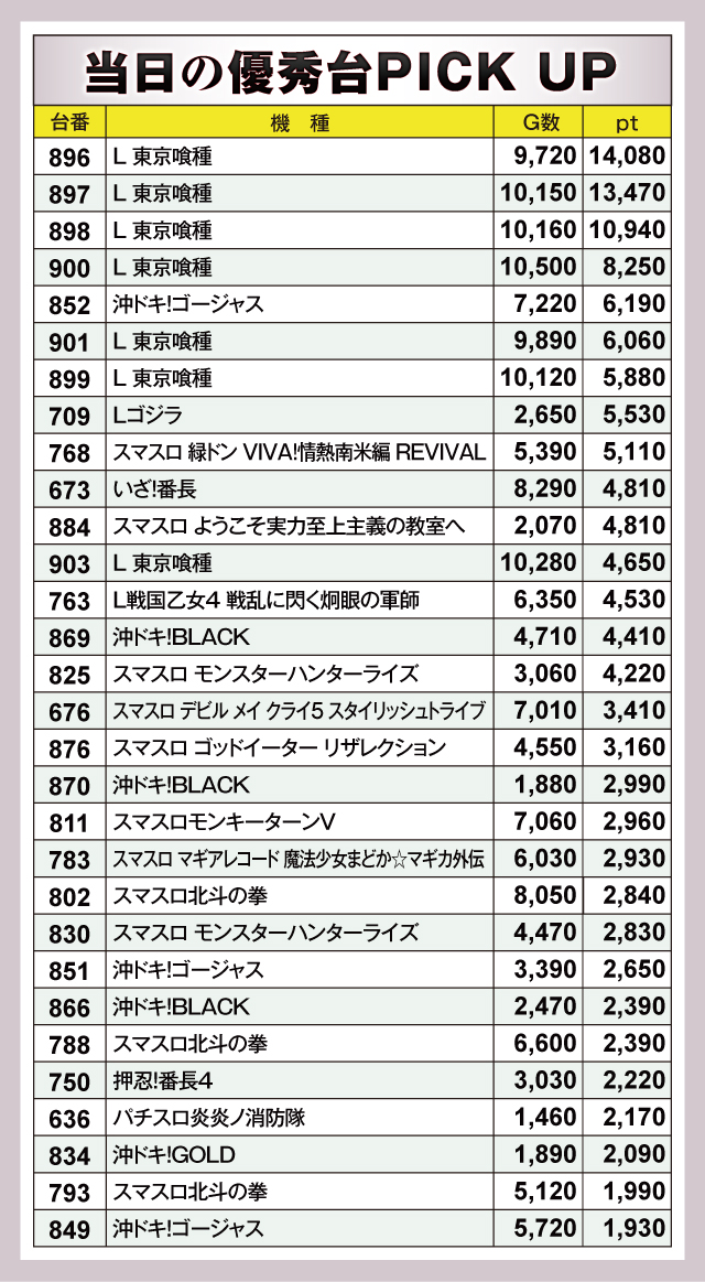 スロットコーナーで注目を集めたのは『L 東京喰種』。896番台が+14,080pt、897番台が+13,470pt、898番台が+10,940ptと1万ptオーバーが3台も現れている。他の機種でいえば『沖ドキ!ゴージャス』852番台の+6,190pt、『Lゴジラ』709番台の+5,530ptなどなど、負けず劣らずの好成績で存在感をあらわしていた。
