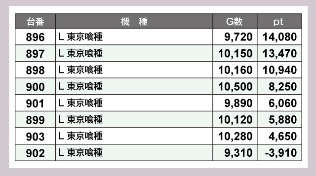 『L 東京喰種』は1万pt超えの3台の他にも優秀台が多数。圧倒的実力を示している。