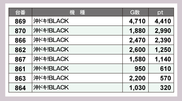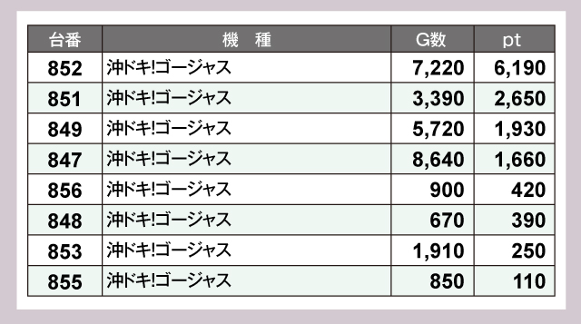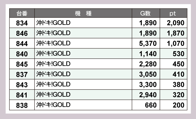 『沖ドキ!BLACK』と『沖ドキ!ゴージャス』、『沖ドキ!GOLD』の3機種も総じて好成績。なかでも『沖ドキ!ゴージャス』852番台の+6,190ptなど、立派な結果を残した台にも注目したい。
