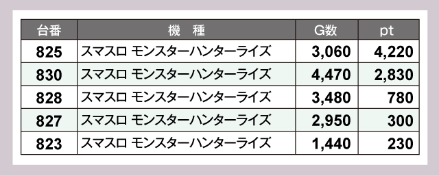 『スマスロ モンスターハンターライズ』からも825番台の+4,220ptや830番台の+2,830ptなど、複数の台がポテンシャルを発揮していた。