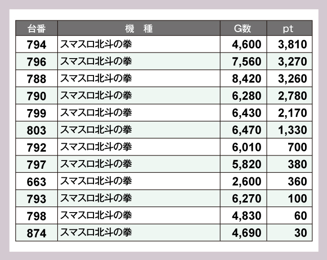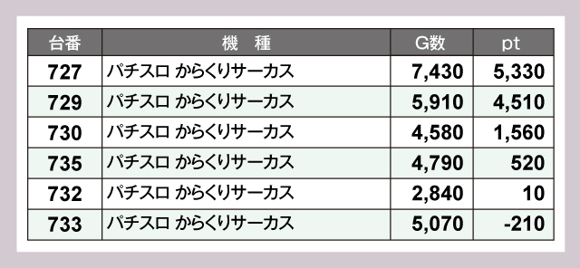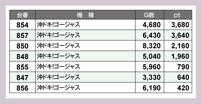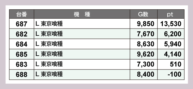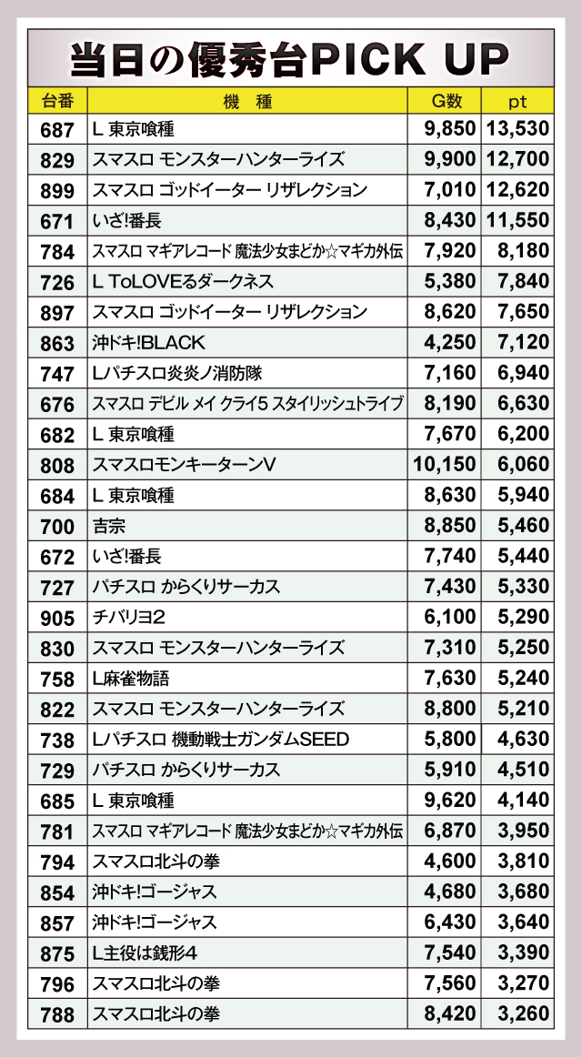 この日は4台が1万ptオーバーを達成。『L 東京喰種』687番台が+13,530ptと、もっとも輝かしい成績をおさめている。つづいて『スマスロ モンスターハンターライズ』829番台の+12,700pt、『スマスロ ゴッドイーター リザレクション』899番台の+12,620pt、『いざ!番長』671番台の+11,550ptと並ぶ。以下も『スマスロ マギアレコード 魔法少女まどか☆マギカ外伝』784番台の+8,180ptなど、目を見張るほどの優秀なデータを見せてくれた。