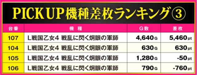 今回のPICK UP機種は差枚上位にランクインした3機種。ハイスコアが飛び出しただけでなく、3機種トータルの全18台中12台がプラス差枚で実戦を終える見事な結果を残しているだけに、ファンにとって充実の一日となったのは間違いないだろう。