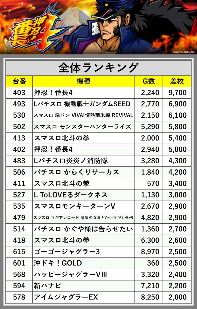 厳選された取材対象機種をはじめ、その他スロット全体から好記録が飛び出した!プレイヤーが楽しんだ1日を下記データにて振り返ってみて欲しい。