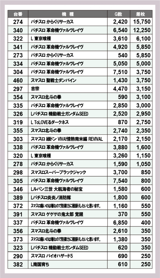 ※差枚数順に掲載しています